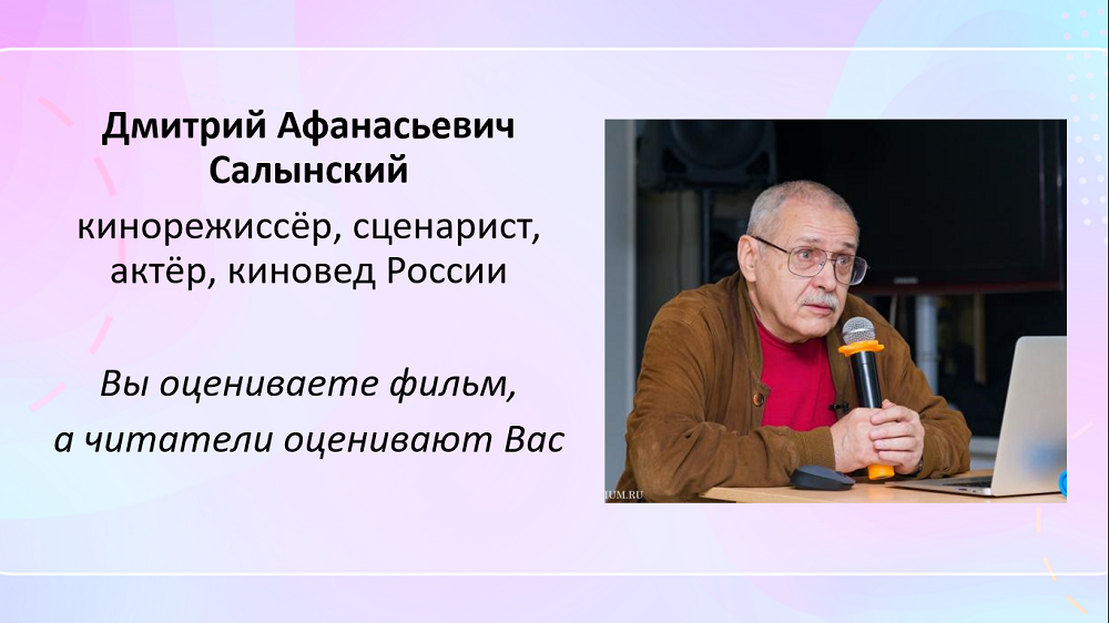 Владислав Сергеевич отметил важность использования жанра рецензии в ходе сравнительного анализа кино и литературного первоисточника. Правильные грамотные рассуждения позволяют выделить в художественном произведении основное, подчеркнуть то индивидуальное, что хотел выразить автор - будь это автор романа или режиссер фильма. Рецензия позволяет систематизировать свое видение художественного произведения, что очень доходчиво и интересно нам продемонстрировала П.А. Чересюк, задействовав и средства наглядности - презентацию!