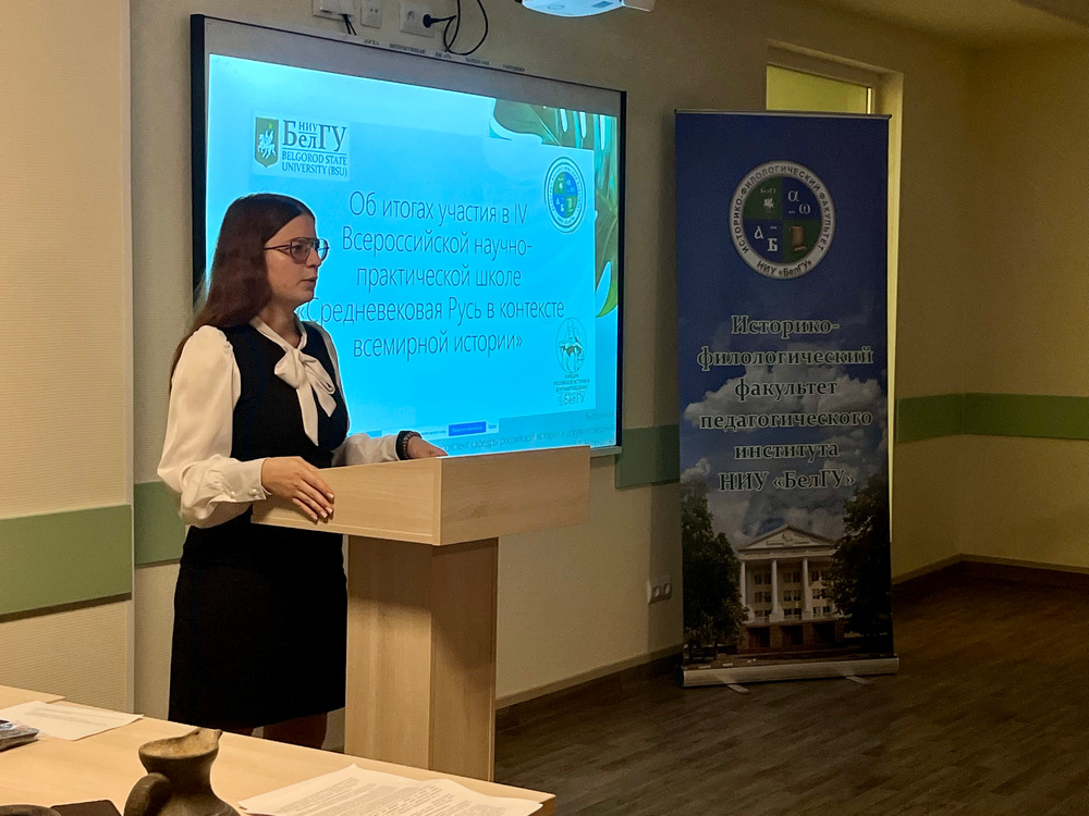 Анна Владимировна рассказала об опыте и итогах участия в IV Всероссийской научно-практической школе «Средневековая Русь в контексте всемирной истории», которая состоялась в мае 2025 года. Историко-филологический факультет НИУ «БелГУ» в данном проекте представляла команда магистрантов и студентов: Анна Непочатова, Максим Титов, Кирилл Шлыков, Александр Лайко, Артем Афтенюк и Татьяна Архипкина. Слушатели познакомились со структурой экспедиционно-образовательного интенсива «Цифровые методы изучения археологического наследия: от теории к практике», в программу которого были включены лекции, мастер-классы, работа круглого стола «3D-фиксация археологических раскопов и находок методом фотограмметрии», занятия по древнерусскому языку и представление проектно-исследовательской работы.