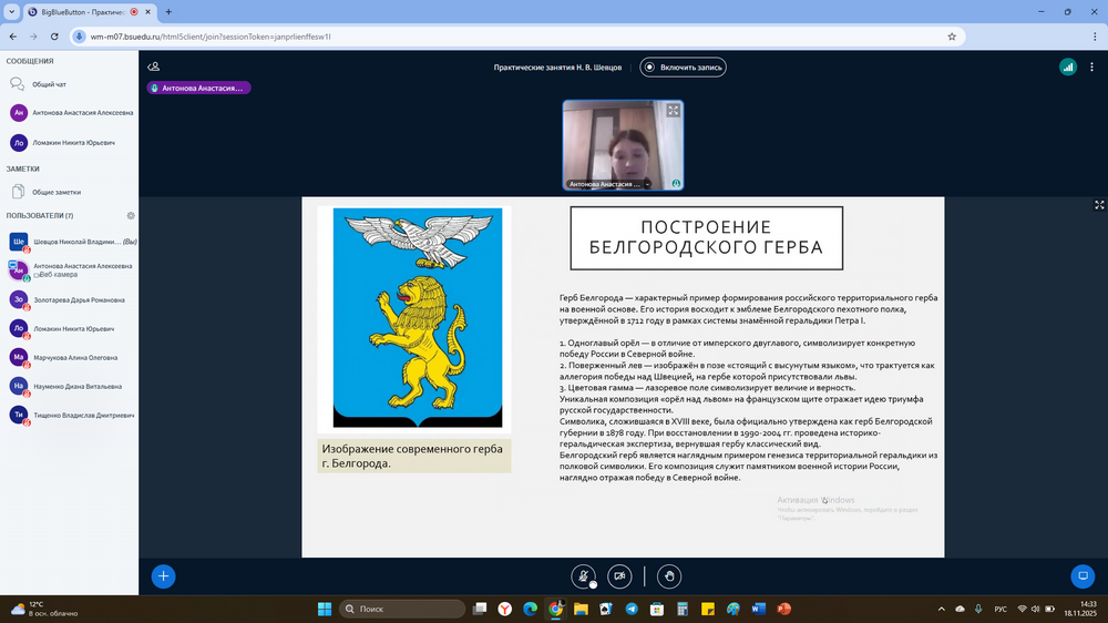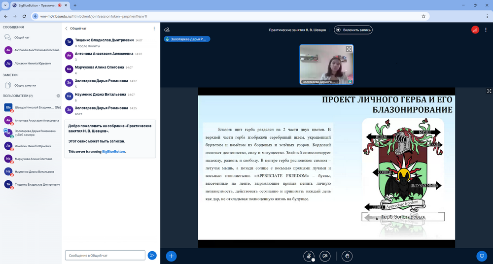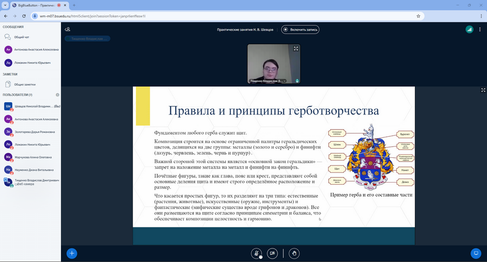 Для того чтобы студенты это осознали и подготовились к проекту, на семинарских занятиях обсуждались рыцарские турниры, формы щитов, фигуры, размещенные на них, и многое другое. В ходе обсуждения касались опыта западноевропейских стран, рассматривали зарождение геральдики в России и то, как она менялась вместе с обществом и государством на протяжении истории, а также изучили знакомый и родной символ нашего края – герб Белгородской области.