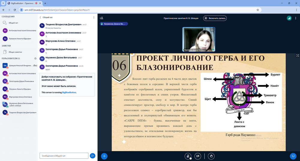 Студенты на протяжении семинаров показали прекрасный уровень владения материалом и подтвердили его защитой проектов, представив яркие презентации и рассказав об этапах развития геральдики. Учащиеся грамотно применили полученные на лекциях и семинарах знания навыки. Всё это говорит о трудолюбии, стремлении постичь новое, а также о творческом потенциале, который трудно было не отметить, рассматривая личный герб каждого учащегося.