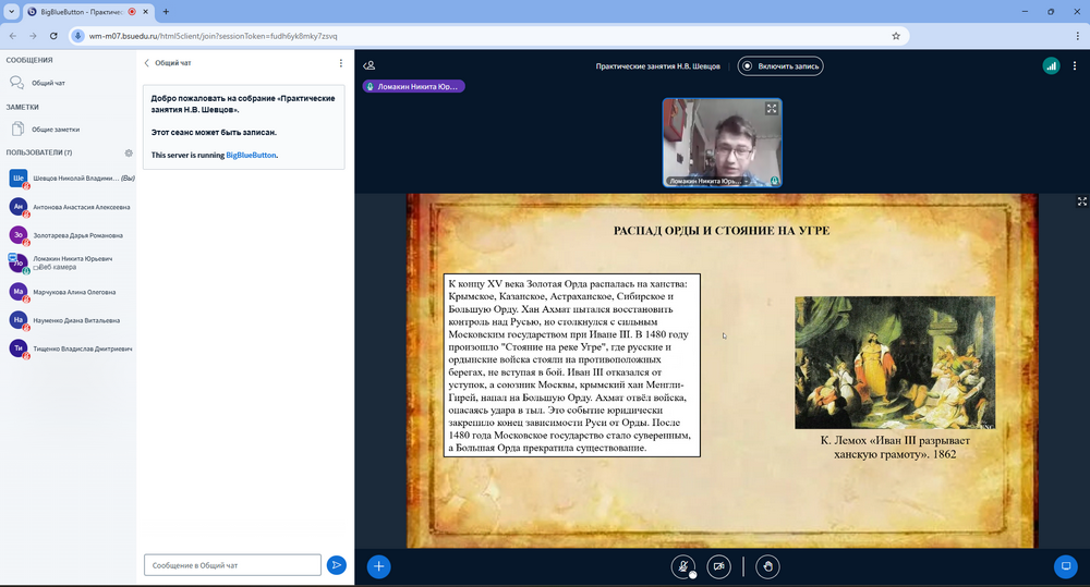 Накануне Нового года 29 декабря 2025 г. на мероприятии «Дорогами Древней Руси» в рамках проекта «Высшая школа педагогики» студенты группы 02032413: Антонова Анастасия, Золотарёва Дарья, Ломакин Никита, Марчукова Алина, Науменко Диана и Тищенко Владислав – представили свои работы, посвящённые древнерусской истории.