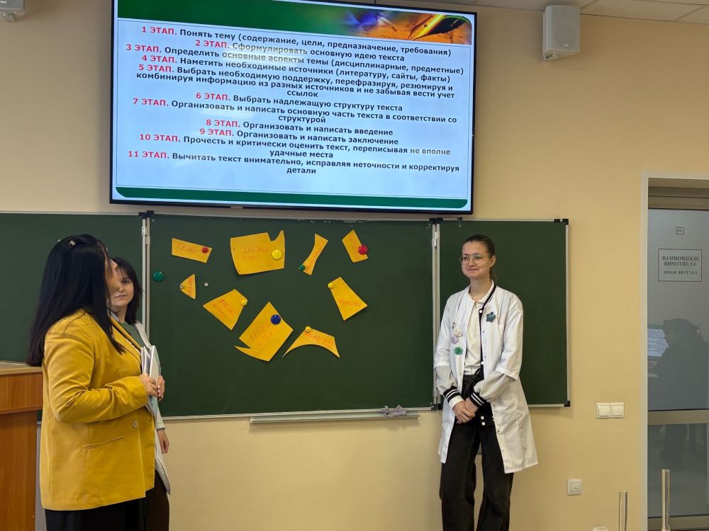 Также во время встречи организаторы мероприятия – доценты кафедры русского языка и русской литературы Гаяне Юриковна Мальцева и Дарья Александровна Черемохина провели мастер-класс «Пишу научную статью». Под руководством преподавателей школьники рассмотрели тему «Преимущества цифровизации в образовании». Они сформулировали тезис, подобрали аргументы и обсудили принцип триады в смысловой и композиционной структуре текста, научившись писать убедительно и грамотно.